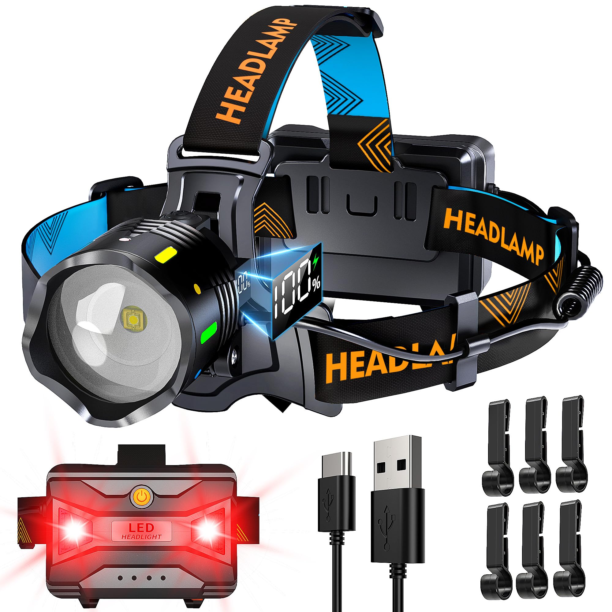 FATA GREUTATE Stirnlampe Led Wiederaufladbar,Superhell 100000 Lumen Zoombar Kopflampe Stirnlampe mit Sensor,3 Lichtquellen und Leistungsanzeige,5000 mAh AKKU IPX7 Wasserdicht Stirnlampen für Outdoor Camping Angeln